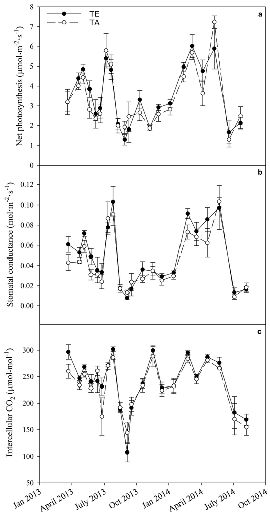 - Teskey, R.O.; Fites, J.A.; Samuelson, L.J.; Bongarten, B.C. Stomatal and nonstomatal limitations to net photosynthesis in Pinus taeda L. under different environmental conditions. Tree Physiol. 1986, 2, 131–142. [Google Scholar] [CrossRef] [PubMed]