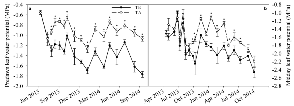 - Attia, Z.; Domec, J.-C.; Oren, R.; Way, D.A.; Moshelion, M. Growth and physiological responses of isohydric and anisohydric poplars to drought. J. Exp. Bot. 2015, 66, 4373–4381. [Google Scholar] [CrossRef] [PubMed]