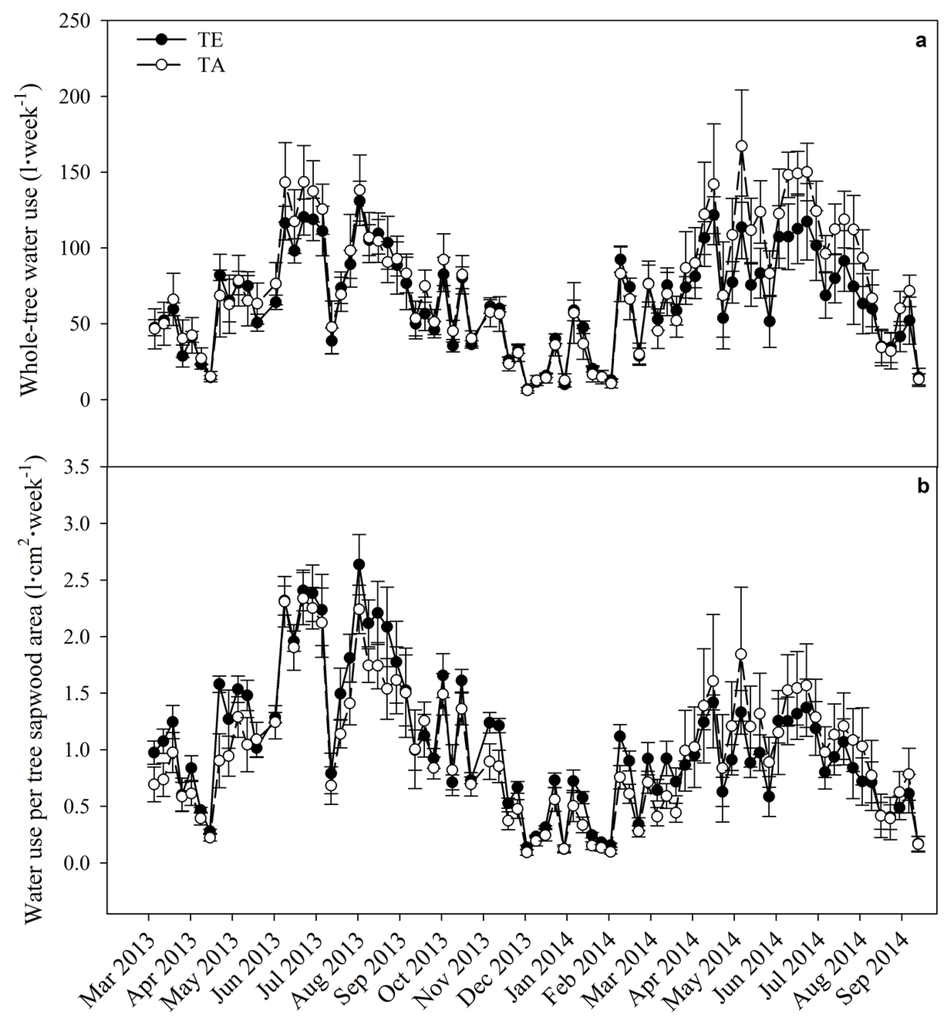 - Ford, C.R.; Goranson, C.E.; Mitchell, R.J.; Will, R.E.; Teskey, R.O. Modeling canopy transpiration using time series analysis: A case study illustrating the effect of soil moisture deficit on Pinus taeda. Agric. For. Meteorol. 2005, 130, 163–175. [Google Scholar] [CrossRef]