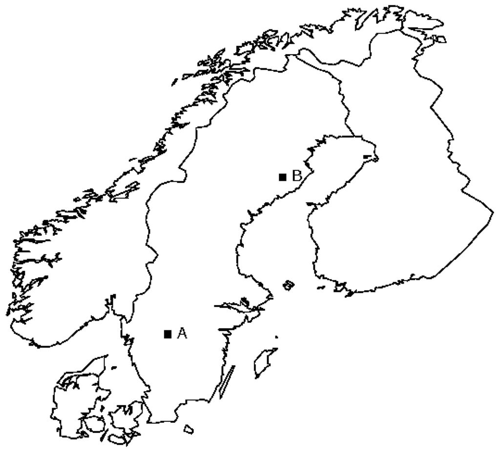 Location of the test sites in Sweden. A: Remningstorp test site; B: Svartberget test site.