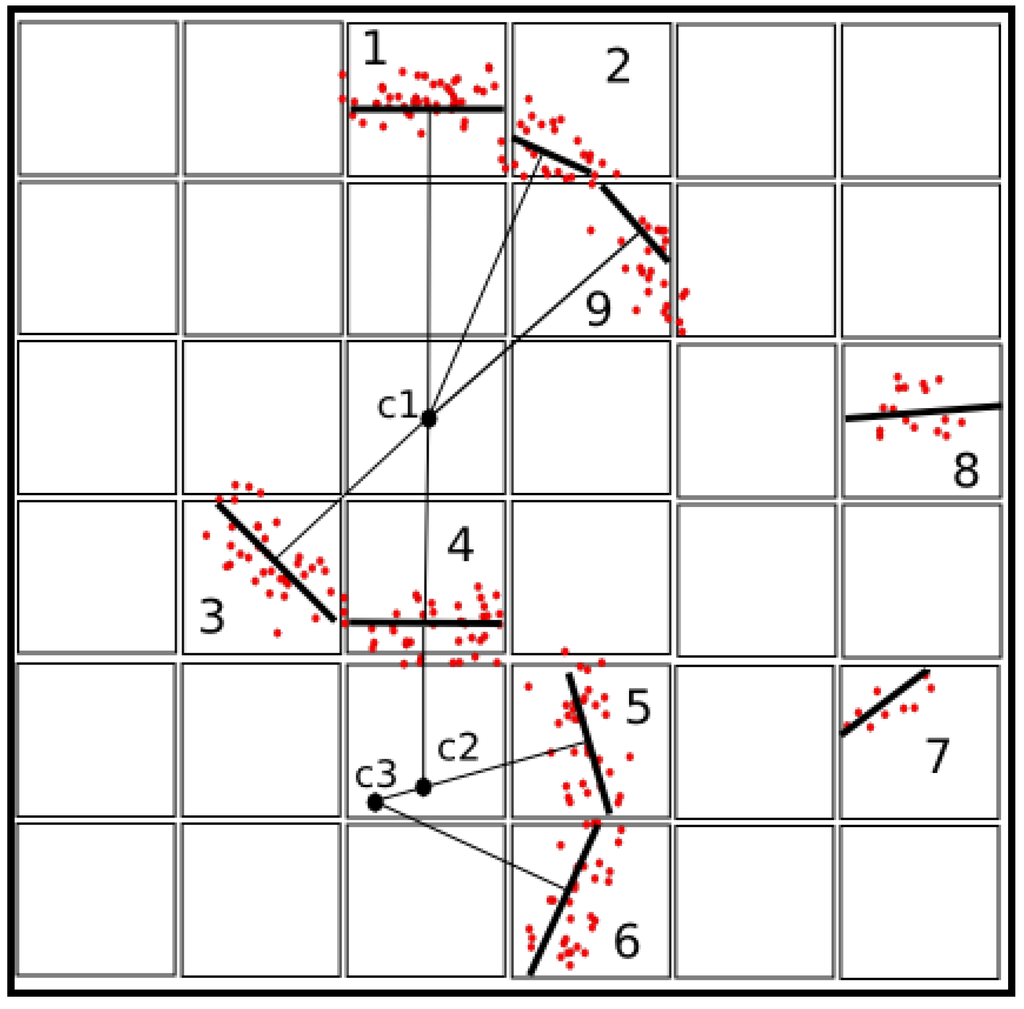 Two-dimensional view of the three-dimensional grid. Cells 1–9 contain laser data points. In each grid cell, a plane (thick line) is derived from the laser data points using the eigenvectors and eigenvalues. The centers c1–c3 are derived from the normals (thin lines) of two connected planes. The plane in Cell 4 is connected to two centers. Planes with several possible centers are connected to the center with the highest weight. The planes in Cells 7 and 8 are not connected to any neighbor and, therefore, not connected to possible tree stem centers.