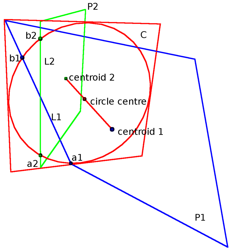 Plane P1 and plane P2 are derived from point clouds with Centroid 1 and Centroid 2. An intersecting plane C with a circle is positioned in between the two point cloud centroids. L1 is the intersecting line between plane P1 and plane C. L2 is the intersecting line between plane P2 and plane C. a1 and b1 are the intersecting points between the circle and L1. a2 and b2 are the intersecting points between the circle and L2. A measure of how well the two planes connect is evaluated by measuring the distances from points a1,b1 and a2, b2 to the opposite intersecting line.
