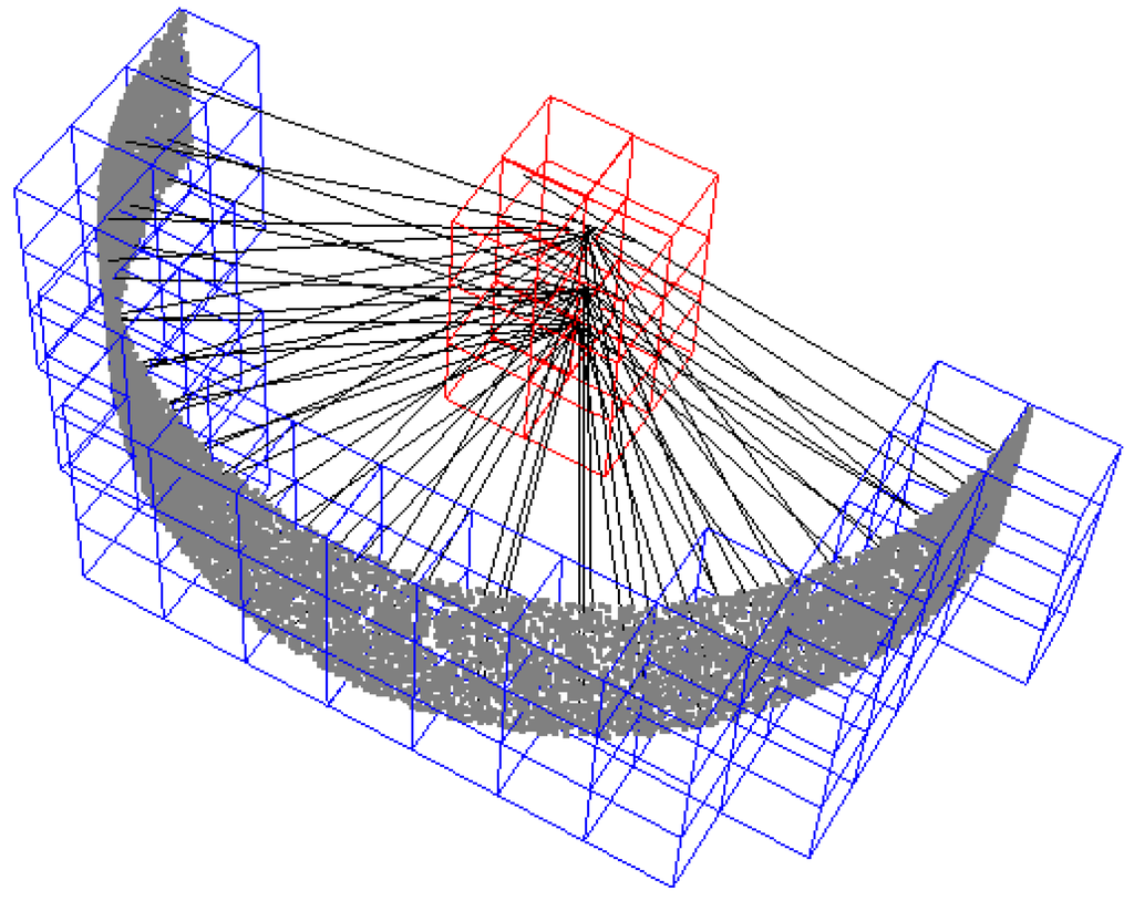 The third version has the advantage that if the points in the cell are located in a corner or along an edge, the center of the spherical neighborhood will be located close to the position of the data points. For the three approximations, all data points within a cell are set to the same property. The versions with a spherical definition of the neighborhood need to test neighbor cell points for proximity, leading to slightly longer processing times.