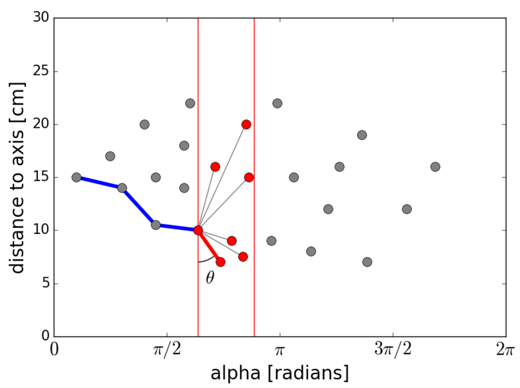 All possible directions of the axis originating from the centroid of the point dataset are tested, first with an angle resolution of 3° and for fine tuning an angle resolution of 0.5°. A moving window convex hull is used to evaluate how optimal an axis direction is; see Figure 6. The purpose of this convex hull is to follow the innermost part of the point dataset for the chosen axis direction as a function of the angle; see Figure 7B,D. A moving window of size 45°, when calculating the convex hull, was chosen since the dataset is not continuous for semi-cylinders. The average absolute deviation from this convex hull was used as a measure of how optimal an axis direction is. Small deviations like in Figure 7D are an indication that the axis is aligned close to the true direction of the cylinder. The moving window convex hull algorithm starts the search at the point at the far left with the smallest distance to the current axis. All of the points to the right of the current point, within the search window, are connected to the first point by lines, and the degree of tilt is calculated; see Figure 6. A line connected to a point located to the right gives an angle within the range of 0–π radians measured from the y-axis. The point connected to the line with the smallest angle is chosen as the next starting point. The search window is moved to the new starting point, and all points to the right within the search window are investigated. This process continues iteratively until the far right of the diagram is reached. All chosen starting points are then interconnected by lines that define the moving window convex hull.