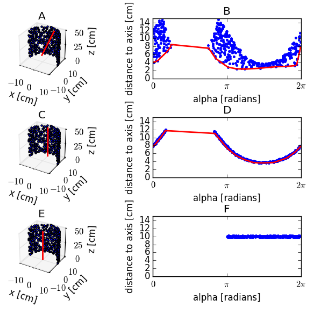 Cylinder fitting of a synthetic point dataset with radius 0.10 m. (A,C,E) The perspective views of semi-cylinder point data with different axis positions. The axis positions are marked in red. (A) The axis is positioned at the centroid of the point dataset and tilted 10°; (C) the axis is positioned at the centroid of the point dataset and is aligned with the true cylinder axis; (E) the axis is positioned at the true center of the cylinder and is aligned with the true cylinder axis. (B,D,F) The radial displacement as a function of the angle of the axis positions in (A,C,E); the red lines in (B,D) are calculated by a moving window convex hull algorithm and are used as a base level from which to calculate the deviation of the dataset.