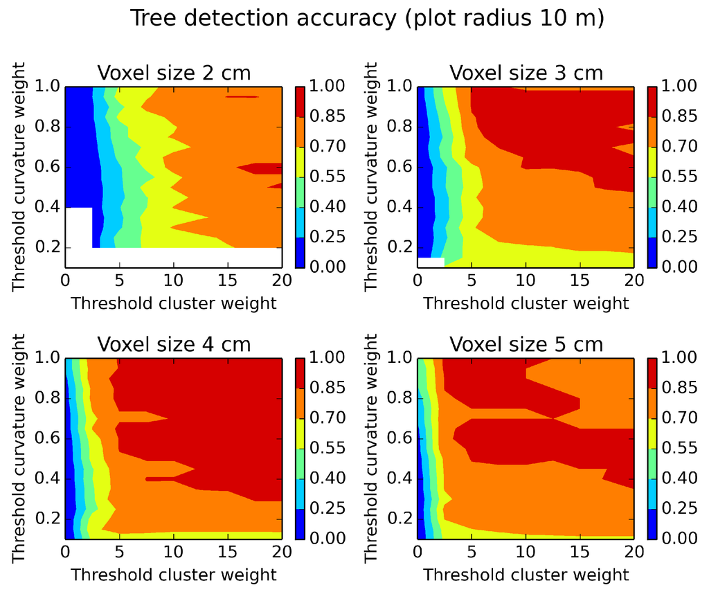 The parameter settings that gave the highest tree detection accuracy for each voxel cell size and plot size are presented in Table 4 and Table 5. It is easier to detect trees in a smaller plot radius than in a larger one, probably depending on the nature of TLS data, which are denser closer to the scanner, and the fact that more trees are shaded in a large plot (in a single scan setup). A voxel size of 3 cm gave the highest tree detection accuracies, whereas a voxel size of 2 cm gave the lowest for the plot size of 10 m. For the 20-m plot size, the voxel size of 4 cm gave the highest tree detection accuracies.