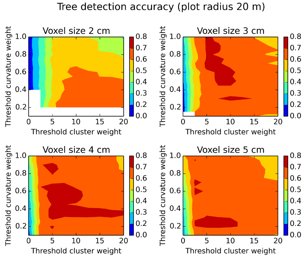 Tree detection accuracy evaluated on a plot of a radius of 20 m and different parameter settings. White areas indicate missing data. The optimum for high tree detection accuracy is achieved with different parameter settings for different voxel sizes.