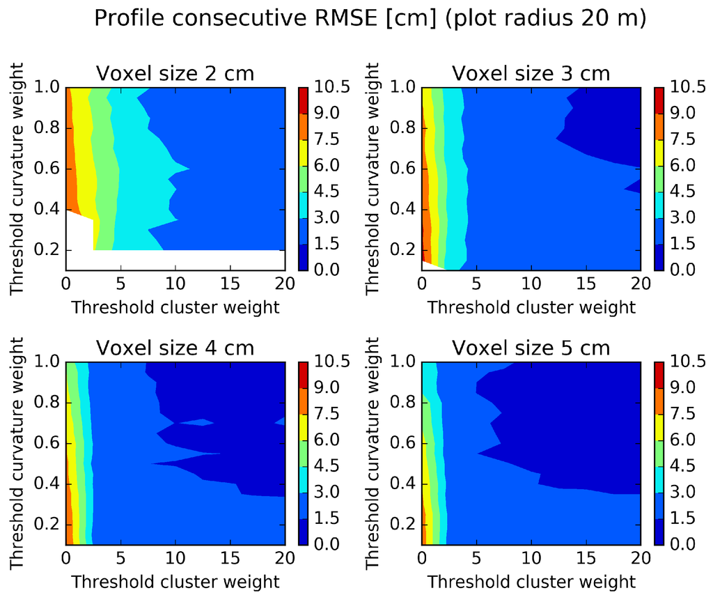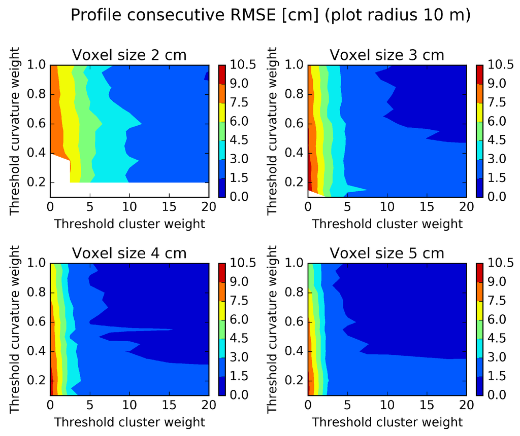 The voxel size of 3 cm had the best tree detection accuracy (Table 4), and for this voxel size, the curve weight of 0.75 and the cluster weight of 15 gave the smallest profile RMSE (Table 6). For the voxel size of 4 cm, there are a number of settings with slightly smaller profile RMSEs at the cost of a lower tree detection accuracy. For large plot sizes, the voxel size of 4 cm seems to be better (Table 5). For this reason, the parameter settings voxel cell size of 3 cm, curve weight of 0.75 and cluster weight of 15 were used in an analysis of how the profile RMSE depends on the distance from the ground (Table 7).