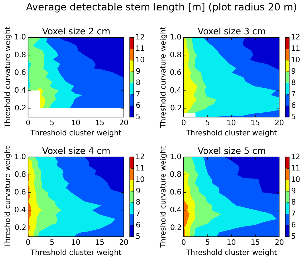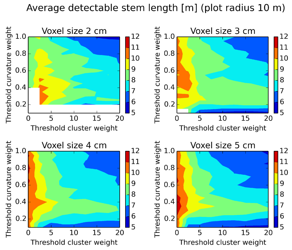 To find the optimal parameter settings of the tree stem detection algorithm, a number of settings was tested on the Remningstorp field plot dataset. The curvature weight threshold was tested in the range of 0.1–1.0 and an increment of 0.05. The cluster weight threshold was tested in the range of 0–20 and an increment of 2.5. Four different grid cell sides of 2, 3, 4 and 5 cm were tested and two different plot radii of 10 and 20 m.