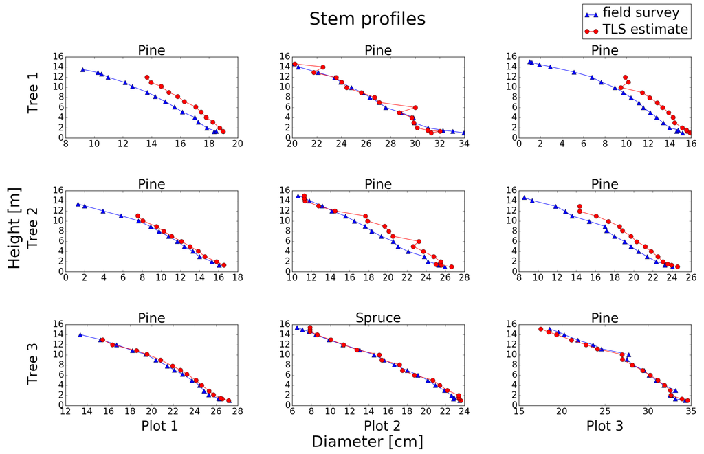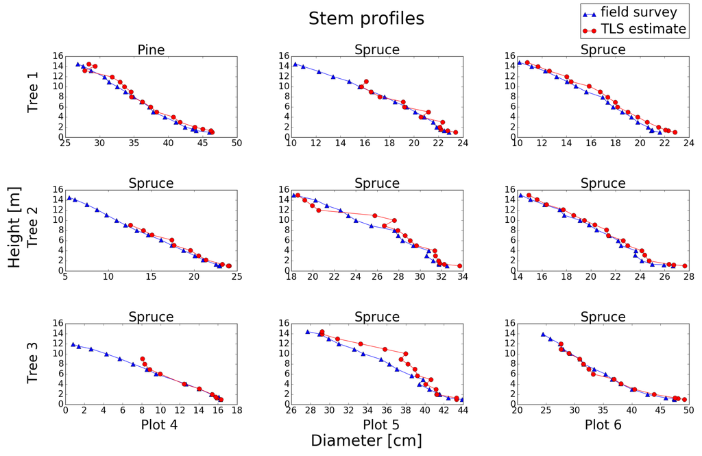 The stem profile can be estimated by allometric functions and the calipered values of the stem diameter at breast height (DBH). These functions are limited to particular climatic, geographic and silvicultural conditions and are developed at the national or local level. Automatic methods for the estimation of stem profiles are motivated because the taper functions can vary greatly in particular regions, as stated by Liang et al. [2]. An overview of recent efforts made to develop locally-adjusted taper functions is given by Trincado and Burkhart [3]. A non-destructive and efficient measurement technique for single-tree stem profile estimation is needed. TLS is such a technique that could be used to develop locally-suitable taper functions [4]. Stem profile estimations from TLS could also be useful to predict between and within forest stand variations in order to plan forest operations and match demands from the forest industry.