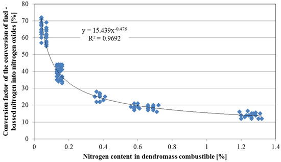 This paper presents a wide, targeted, operational experiment on the conversion of fuel-bound nitrogen to nitrogen oxides. The experiment was implemented by studying the production of energy in 16-grate boilers. The conversion factor was determined based on the nitrogen content in individual types of dendromass and on nitrogen oxide emissions in flue gases. In measuring emissions, 103 average values for the concentration of nitrous oxide were found. Every average value was set using three consecutive half-hour emission measurements. The specific thermal output of the boilers was 300 to 2500 kW. The nitrogen content in the deliberately selected dendromass was within a wide interval of Ndaf values between 0.04% and 1.26%. The dependence of the conversion factor, XNOx, upon the content of fuel-bound nitrogen is very accurately expressed by the power function.