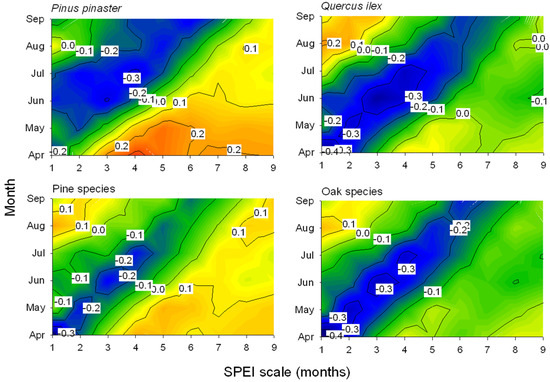 Contour plots showing the correlations (Pearson coefficients) calculated by relating the mean defoliation series of two selected pine and oak species or the means for all pine and oak species and the Standardized Precipitation-Evapotranspiration Index (SPEI) drought index. Correlations were obtained for SPEI indices calculated for one- to nine-month long scales (x-axes) during the growing season from April to September (y-axes). Correlation values which are higher than |0.25| are significant at p < 0.05.