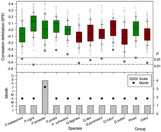 Box plots showing the correlations (Pearson coefficients) calculated by relating the mean defoliation series of each tree species or group and the April SPEI drought index considering 1- to 12-month long time scales. Different colours correspond to pine (dark-green boxes and symbols); and oak (dark-red boxes and symbols) species, respectively. The SPEI was calculated considering all months and 12-long month scales. The lowermost figure show the most negative correlations observed for specific SPEI temporal scales (bars, right y-axis) and months (symbols, left y-axis). In the uppermost plot the dashed lines show the 0.05 and 0.01 significance levels.