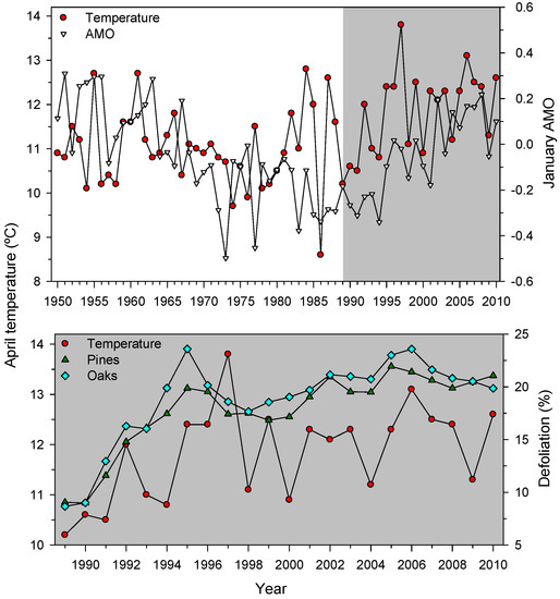 Temporal trends of mean April temperature (left y-axis) across Spain and the January AMO index (right y-axis, top figure). The lowermost plot shows the positive association observed between April temperature and the mean defoliation series of pine and oak species. The grey background highlights the 1989–2010 study period.