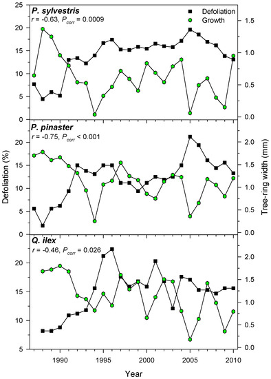 Growth and defoliation were negatively related, but this inverse association was stronger in the case of P. pinaster or P. sylvestris than in Q. ilex selected plots (Figure 5).