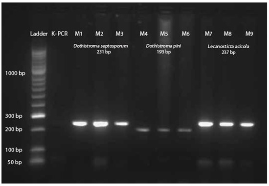 - Ioos, R.; Fabre, B.; Saurat, C.; Fourrier, C.; Frey, P.; Marcais, B. Development, comparison, and validation of real-time and conventional PCR tools for the detection of the fungal pathogens causing brown spot and red band needle blights of pine. Phytopathology 2010, 100, 105–114. [Google Scholar] [CrossRef] [PubMed]