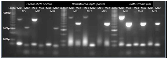 - Drenkhan, R.; Hantula, J.; Vuorinen, M.; Jankovsky, L.; Müller, M.M. Genetic diversity of Dothistroma septosporum in Estonia, Finland and Czech Republic. For. Pathol. 2012, 136, 71–85. [Google Scholar] [CrossRef]