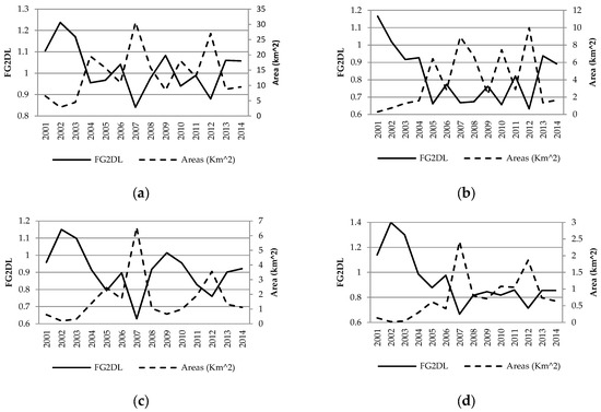At the county level, the correlation coefficient between FG2DL and the deforested areas is high (R2 value of 0.91), but it is lower at the TAU level: 0.61 in Săpânța and 0.83 in Vișeu de Sus, being the lowest and highest value. Hence, as R2 increases, there is a closer correlation between the deforested areas and FG2DL and, thus, the higher FG2DL values indicate that deforestations are in more compact and homogeneous clusters, but dispersed between each other.