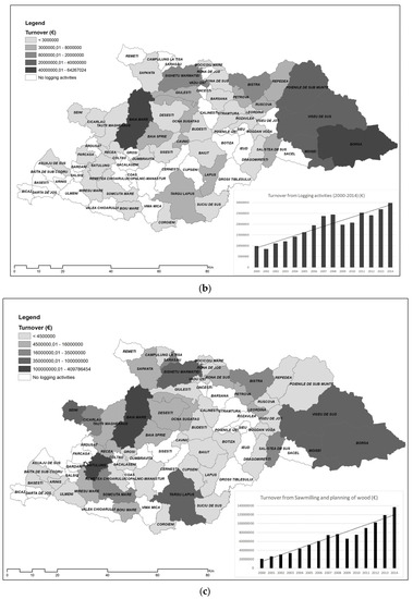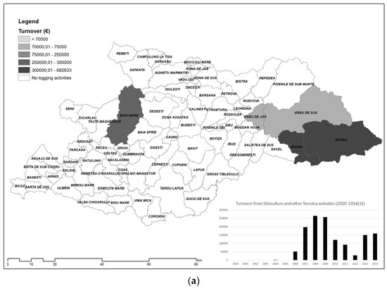 Figure 7a–e represents the distribution of the turnover of (a) sylviculture and other forestry activities; (b) logging; (c) sawing and plantation of woods; (d) joinery installations; and (e) wholesale of woods, construction materials, and sanitary equipment for all administrative units in the county of Maramureș. The spatial representation of these economic activities, for the county of Maramureș, is provided at the level of the TAU as given by the NACE codes (statistical classification of economic activities in the European Community). What can be seen is that an important part of the turnover reflecting the economic activity related to timber harvesting can be found in some municipalities that do not have large forested areas, but are rather centered nearby Baia Mare, Borșa and Vișeu de Sus. This pattern can be explained by the development of subsidiaries of multinational companies, which was conducted mainly in the county capital (Baia Mare) and other cities in the county of Maramureș (Vișeu de Sus, Baia Sprie, Sighetu Marmației, etc.).