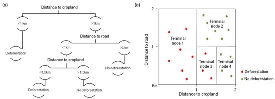 In this illustrative example land cover is predicted based on distance from cropland and road. Both pictures display the same decision problem using different representation systems: (a) shows the classification tree with three internal nodes and four terminal nodes; (b) shows the partition of the two-dimensional predictor space. In (b) the regions are entirely deforested or forested, a situation that is quite unusual in real-world models.