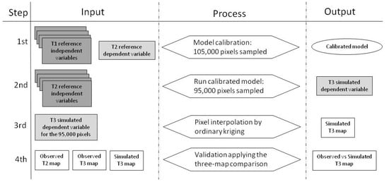 - The calibrated model and the fitted parameters used in the calibration procedure were used to predict the dependent variable at time t3 for the 95,000 pixels.