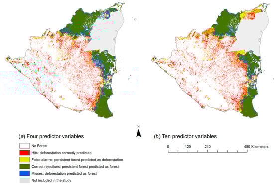Performing the process twice, using two sets of predictors, also allowed us to screen the most relevant biophysical and demographic predictors affecting deforestation in Nicaragua. Considering our purposes, using four predictors (FourPA) provided better results than using 10 (TenPA), even though quantity disagreement was higher for FourPA. We seek to accurately identify areas where both deforestation and forest persistence might occur in the future. However, if the study had been aimed at predicting total carbon emissions, without referring to the location where they might occur, then knowing the allocation disagreement (i.e., the area where emissions would take place) would not have been fundamental. The reason including 10 predictors did not improve the prediction accuracy is likely related to the fact that the six predictors added in TenPA were not relevant drivers of deforestation in Nicaragua during the considered time interval. However, some drivers of deforestation can change over time, so a good predictor in 1983 might be a bad predictor in 2000. To analyze and explain all the potential reasons related to the different performances of the two alternatives (FourPA and TenPA), a comprehensive investigation of the land-use dynamics from 1983 to 2011 should be carried out, though such analysis goes beyond the scope of this paper.
