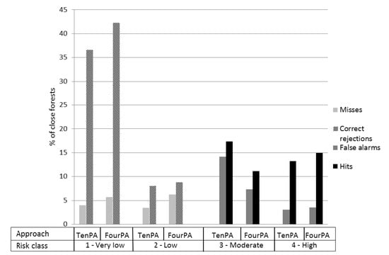 Accuracy is also reported in numerical terms in Table 3, which represents the confusion matrix between the simulated land-use changes and the reference changes. The classification error for the two modeling alternatives was similar. The additional six predictors included in TenPA did not improve the overall accuracy, which in both alternatives was 76%. However, the predictions of the two alternatives were different, as described through the measures of accuracy considered in this study. The deforestation correctly predicted by FourPA was lower than that predicted by TenPA (26% versus 30.6%), but the number of “false alarms” (i.e., persisting forest predicted as deforestation) was also higher in TenPA (17.3% versus 10.8%) (Figure 5). This means that TenPA classified more pixels as deforested and, accordingly, detected more deforestation than FourPA. The larger number of pixels classified as “deforestation” by TenPA was also evidenced by calculating the producer’s and user’s accuracy; in fact, the proportion of pixels incorrectly classified as “deforestation” (as defined by the user’s accuracy) was higher in TenPA (Table 4). Figure 5 shows the four components of agreement and disagreement resulting from the validation process; values are expressed as the percentage of forest at t2 and are divided by classes.