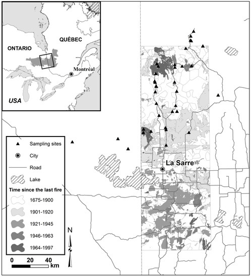 In Canada, the boreal forest represents approximately 60% of the economic resources for the forest industry [6]. In addition, boreal ecosystems provide a diverse range of habitats for wildlife [6]. During the last few decades, the expansion of intensive harvesting has prompted the need to find a compromise between preserving biodiversity, maintaining forest ecosystems resilience, and providing resources for the wood and paper industries [6]. Facing these needs, interests for a sustainable forest management approach based on natural fire dynamics has increased [7,8,9,10]. Natural fires shape landscape structures and composition by creating forests of various ages and by favoring the conservation of shade-intolerant species (e.g., jack pine, trembling aspen) in areas with high fire activity and of tolerant species (e.g., balsam fir) in landscapes rarely influenced by fire [6,7,8,9]. Forest management that recreates landscapes similar to those generated by natural fire preserves biodiversity and long-term ecosystem functionality [10,11,12,13].