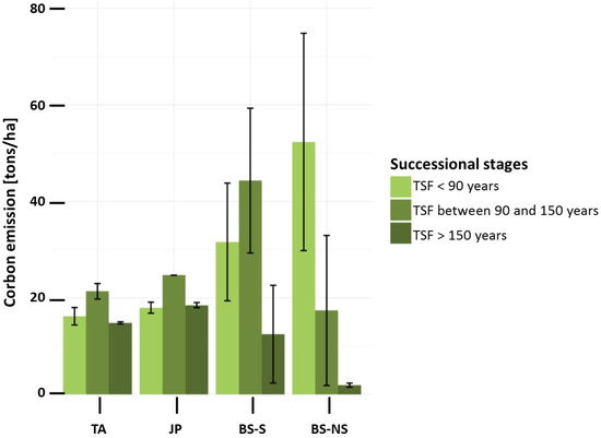 CanFIRE potential carbon emissions averaged by early (TSF < 90 years), intermediate (TSF between 90 and 150 years), and late (TSF > 150 years) successional stages, and by dominant forest types of the Clay Belt boreal landscape (trembling aspen (TA), jack pine (JP), black spruce originating from severe fire (BS-S), and black spruce originating from non-severe fire (BS-NS) forests). Error bars represent the mean standard error.