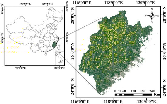 Geographical distribution of the inventory sample plots within pure China fir stands.