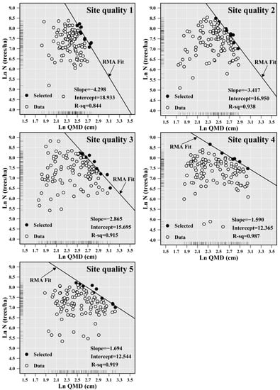 The selected fully stocked plots are indicated by the black points in Figure 2, with which the self-thinning lines were produced for these 5 forest site categories using RMA (Figure 2). The estimated slope coefficients and their corresponding 95% confidence intervals are provided in Table 2. The fitting statistics, i.e., RMSERMA and R2, demonstrated a promising precision of the produced self-thinning lines. For instance, R2 ranged from 0.844 to 0.987.