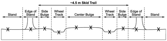 Profile view of the model transect. Strata are defined by relative position to wheel tracks, tree boundary, and distance to nearest skid trail. ‘X’s mark sampling points.