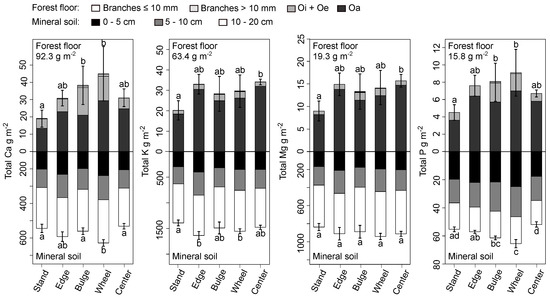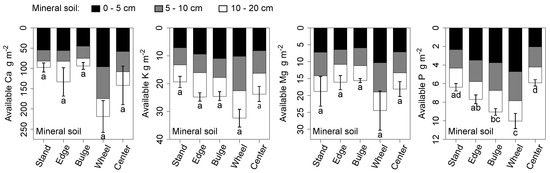 Mineral soil Ca, K, and P stocks in the wheel track stratum were likewise significantly higher than those of the stand (Figure 2, bottom half). At most, skid trail Ca, K, Mg, and P stocks were respectively 84.0, 163, 104, and 10.2 g m larger than the stand’s stocks. In each case, those differences were greater than the balance in stocks missing from the overlying brash mat. Soil nutrient stocks also did not follow any single pattern: Mg stocks in skid trail strata did not differ significantly from stand stocks, Ca and K only partially differed from stand stocks, and P stocks were noticeably concentrated in skid trail strata with the exception of the center bulge.