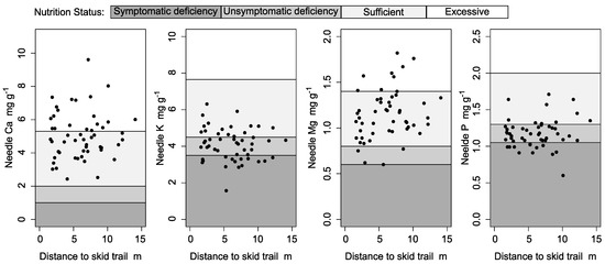 Nutrient concentration in first generation needles in relation to distance from skid trail (2015). Shading refers to nutrition status as classified by Göttlein [24].