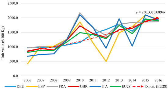 The price development in Figure 1 was estimated as average real price (2006–2016) of imported products to the EU. EU imports are dominated by five countries (which cover about 98% of the extra-EU import market in all the years considered). Prices increased at a remarkable rate, having doubled in the last 10 years.