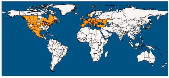 An increasing number of connections between adventive insects (acting as vector) and local fungi (acting as pathogen) occur in forest ecosystems [62,63]. According to Ghelardini et al. [61], establishment of novel links between pathogens and their vectors, climate change, latent and cryptic pathogens are a few of the important factors identified that cause tip-blight of pines, also called dieback, due to Diplodia sapinea or D. pinea and its association with an adventive insect, Leptoglossus occidentalis Heidemann. Figure 2 shows the current presence of L. occidentalis in the world. There are many cone and seed insects of pines mentioned in the literature. For example, Dioryctria mendacella Staudinger, Ernobius parens Mulsant and Rey, Ernobius impressithorax Pic, Pissodes validirostris Sahlberg, and L. occidentalis [64,65,66,67,68]. However, L. occidentalis is one of the most extensively studied insect vectors on pine nuts.