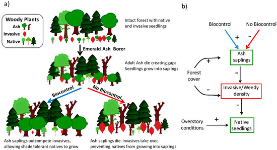 (a) Visual representation of the forest transition with and without biocontrol. This graphic outlines the hypothesis that as gaps are created from the loss of mature ash trees, EAB biocontrol agents, mainly T. planipennisi an introduced EAB natural enemy, can protect ash saplings, buying time for native seedlings to grow and fill gaps (left pathway). Without the influence of the EAB biocontrol program, ash do not survive long enough to allow the native community to recruit, resulting in invasive and weedy species taking over (right pathway); (b) Graphical representation of analysis testing the hypothesis, with positive and negative signs indicating our original expectations.