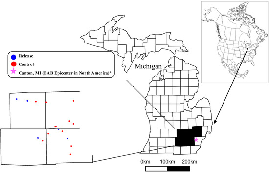 In the summer of 2014, we sampled forest composition at sites of varying distance from parasitoid release locations in southeastern Michigan, USA. A total of 21 sites were selected and surveyed (Figure 2). The sites were classified as a release site if parasitoids were released <1 km away (Supplementary Material 1). Seven release sites were chosen at random from the 22 parasitoid release locations within the counties of Ingham, Jackson, Livingston, Oakland and Washtenaw in 2014 [61]. The parasitoids were released in wooded stands larger than 16 ha, that were >100 m from a road and that would not be harvested or developed for at least five years after release. The 14 control sites were selected in the general area of the release plots to reflect similar vegetation types. Control sites were between 4.1 km and 20.5 km to the nearest release location (Figure 2, Supplementary Material 1). The climate in the area is characterized by cold winters (average minimum temperature in January is −8.8 °C) and warm summers (average maximum temperature in July is 28.8 °C) with a total annual precipitation of 953 mm evenly distributed along the year. Most soils of the region derive from end-moraine ridges and ground moraines, and from alluvial deposits along river valleys.
