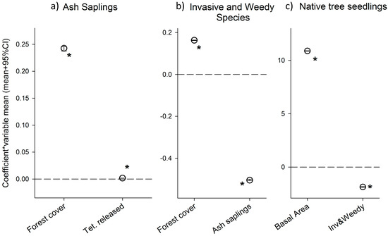 Posterior parameter means (+95% CI) of each of the parameters included in the analyses for each submodel, ash saplings (a); invasive and weedy species (b); and native tree seedlings (c). Parameters have been standardized (i.e., multiplied by the covariate mean, except for T. planipennisi releases where we used the orthogonalized variable which is centered around zero) to assess their influence. Coefficients that were statistically significant (95% CI did not overlap with zero) are indicated by an asterisk. Note: symbols are larger than the 95% CIs.