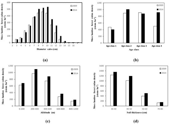 Culms density was greater in 2014 than in 2009, with a 15.3% increase in density observed over this time period. For different diameter classes, density was lower in the 0 to 10 cm diameter class, but higher in the 10 to 20 cm diameter class in all plots in 2014 compared to 2009 (Figure 2a). For different age classes, culms in age classes 2 and 4 increased by 12.3% and 82.5%, respectively, from 2009 to 2014. On the contrary, culms in age classes 1 and 3 decreased by 14.7% and 0.03%, respectively (Figure 2b). Moreover, age class 4 culms density was significantly higher in 2014 than in 2009 (p < 0.001). For both years, we found that 61.9% of the culms were distributed at an altitude from 200 to 600 m (Figure 2c), and 80.2% were encountered in 30–50 cm soil thickness (Figure 2d).