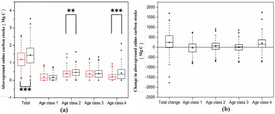 Aboveground culms carbon stocks (a) and change in carbon stocks (b) in all sample plots. Red color represents the carbon stocks in 2009, and black color represents the carbon stocks in 2014 in (a). The symbols ** and *** denote significant differences between carbon stocks in 2009 and 2014 at p < 0.01 and p < 0.001, respectively.