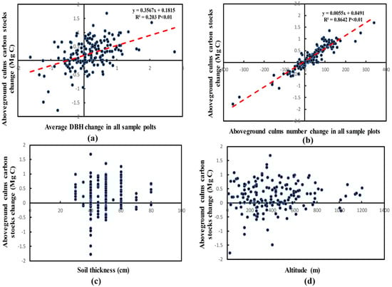 Relationship between culms carbon stocks and average DBH changes (a), culms number changes (b), soil thickness (c), and altitude (d) among sample plots.