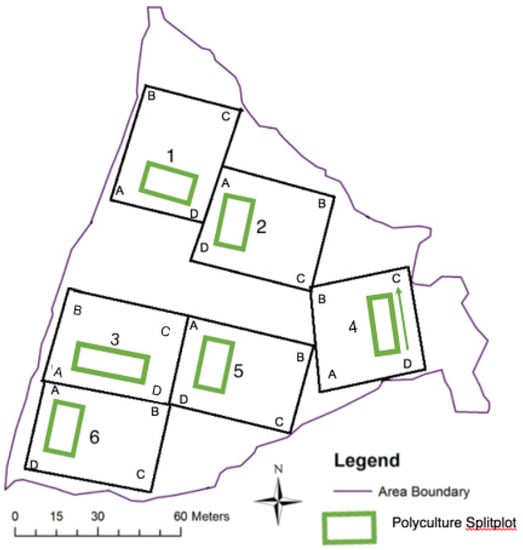Whole plot (1–6) and subplot configuration of shortleaf pine and loblolly pine monoculture and pine/hardwood polyculture plantings in rehabilitated legacy mined land in eastern Kentucky.
