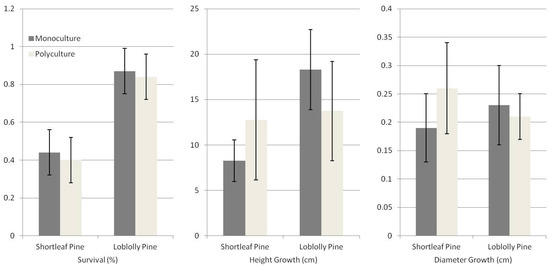 First-year growth and percent survival of shortleaf pine and loblolly pine planted in pine monoculture and pine-hardwood polyculture on rehabilitated legacy mine land in eastern Kentucky.