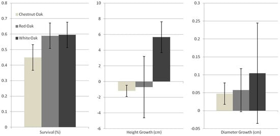 After one growing season, most seedlings experienced positive growth in their height (77%) and diameter (72%). Negative height growth was related to deer and elk browse that sheared the tops off of the seedlings. Diameter growth did not differ between the two pine species, averaging 0.22 cm and ranging between −0.6 cm and 1.79 cm (Figure 3). Hardwood diameter growth was about half that of the pines with highest growth in white oaks (mean = 0.1 cm; range = −0.6 cm–1.1 cm) followed by chestnut oak (mean = 0.08 cm; range = −0.25 cm–0.5 cm), and red oak (mean = 0.06 cm; range = −0.8 cm–0.65 cm) (Figure 4). A similar species-specific pattern was observed in height growth. Individual loblolly pine seedling growth ranged from −11 cm to 69.3 cm and loblollies had the largest average height increase (16.02 cm), which was significantly greater than all the hardwoods but not shortleaf pine. Shortleaf pine height growth ranged from −19.8 cm to 72.5 cm with an average (10.51 cm) that was approximately 5.5 cm less than loblolly pine. Shortleaf pine height growth was not significantly different from loblolly pine growth but was significantly larger than two of the three hardwoods. White oak seedling height growth ranged from −32.2 cm to 52.5 cm. White oaks had the largest height growth among the hardwoods and was the only hardwood species to achieve a positive average height growth (5.65 cm). Although many red oak seedlings experienced positive height growth, ranging from −27.9 cm to 19 cm, their average was negative (−0.71 cm). Similarly, chestnut oak height growth ranged from −15.5 cm to 7.5 cm and averaged −1.19 cm. Despite the range of height growths among the hardwoods, none were significantly different from each other. Collectively, these results suggest that diameter growth was similar among all five species but that the pines grew taller than hardwoods, with the exception of no significant difference between shortleaf pines and white oaks.