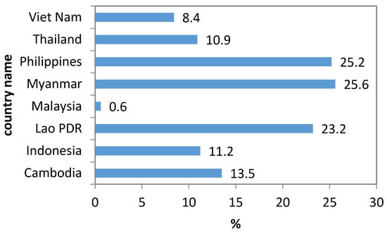 Vietnam has a remarkable record for achieving the first of the Millennium Development Goals (MDGs)—by reducing poverty by half over the period 1990–2015—more than a decade in advance of forecast rates of change. According to the most recent progress report published in 2005 [10], the percentage of households below the poverty line (assessed as the cost of adequate food plus non-food essentials) fell from 58% in 1993 to less than 24% in 2004, while extreme poverty (food costs alone) dropped from 25% to below 8%. As compared with other countries in Asia, Vietnam has made significant progress in reducing poverty over the past two decades compared with countries such as Lao PDR, Philippines and Myanmar, which have very high poverty rates in the range of 23.2–25.6% (Figure 2).