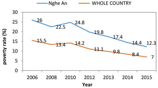 For the period 2010–2015, Vietnam was able to reduce the incidence of poverty from 14.2% in 2010 to 7% in 2015 (Figure 3). However, the poverty rate in the mountainous regions is still very high. Nghe An Province is a mountainous area where most people rely on forest resources for their livelihood. More than 80% of the Nghe An area is mountainous. Nghe An is composed of 217 commune administrative units of which 195 are mountainous and remote communes. According to the General Statistics Offices (GSO), the poverty rate of Nghe An was 25% in 2006 but sharply declined to 12.3% in 2015. However, this figure is double that of the whole country. Since most household incomes in the mountainous areas are derived from forest products, there is a need to improve forest production and protection to enhance their incomes.