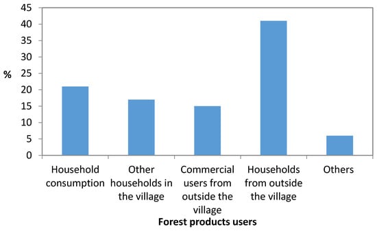 The survey respondents were asked if they were aware that deforestation and forest degradation are linked to climate change, since CO2 is released to the atmosphere once the trees are cut. Out of 300 respondents, 290 (96.6%) said they were aware of the threat of deforestation and forest degradation to the environment. Despite this high rate of awareness, the number of households that had recently cleared forests was high. About 45% of households admitted that they had cleared the forest for various purposes during the past 5 years. As shown in Figure 5, 21% of interviewed households admitted that they themselves cleared the forest for their personal use while 17% of forest users reported that people from other villages were also responsible for the forest clearings. According to 41% of respondents, the main forest users were households from outside the villages. Moreover, 56% of forest users were reported to be outsiders, which included commercial and household users. These users are normally companies that collect timber, such as acacia and bamboo, for industrial purposes (Figure 5).