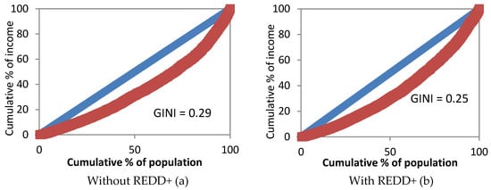 Lorenz curve of farmers in Con Cuong District, Nghe An Province. (a) Without REDD+; (b) With REDD+.