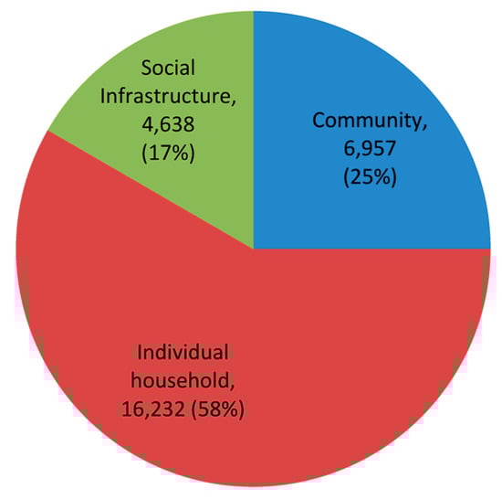 The total area of forestland that was flooded due to the construction of the hydropower plants was 562,743 ha in 2013 and 273,982 ha in 2014 [24]. However, payments were only received by forest owners who were members of organizations and state enterprises. The remaining forest owners, such as individual households and community forests, were not able to receive their payments because of unclear boundaries among forest owners. According to the FPDF report, the total amount paid from the FPDF was VND 16.141 billion, of which VND 6.245 billion was paid to forest owners in 2012 and VND 5.682 billion in 2013. Unpaid fees to forest owners, including individual households, private owners and community forest owners, amounted to VND 3.254 billion.